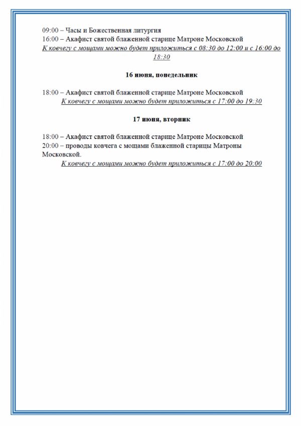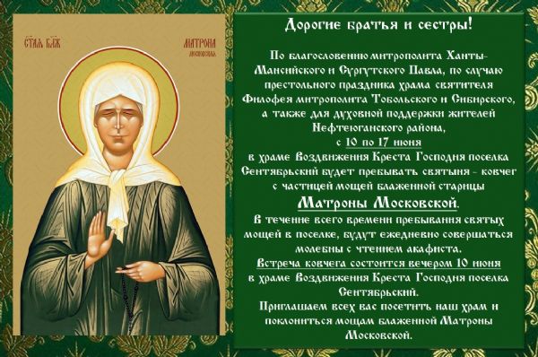 В поселок Сентябрьский пребудет ковчег с мощами блаженной старицы Матроны Московской