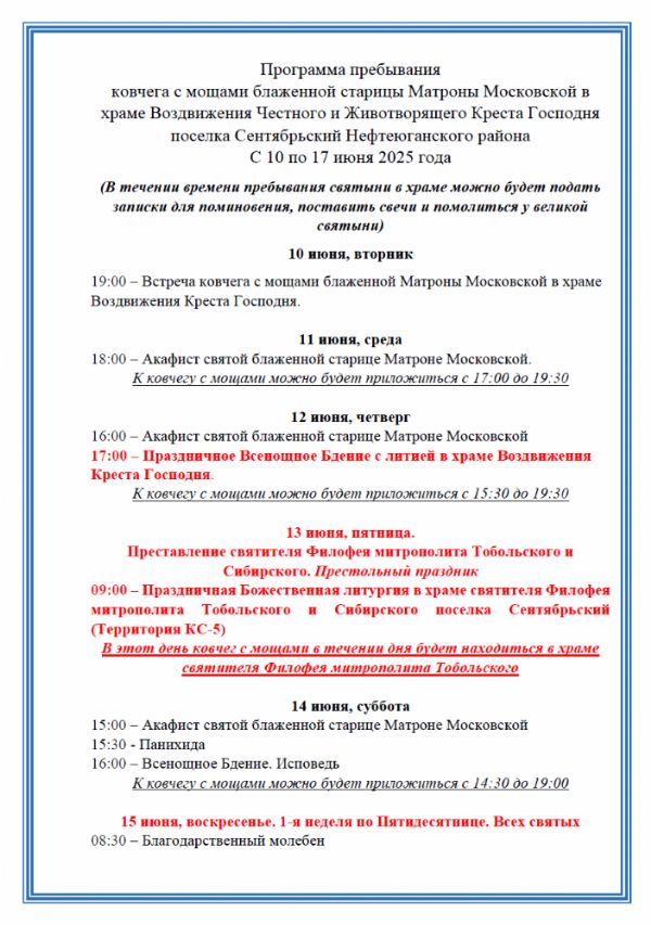 По благословению митрополита Ханты-Мансийского и Сургутского Павла с 29 сентября по 5 октября в храме Воздвижения Креста Господня будет пребывать ковчег с частицей мощей особо почитаемой в православной Церкви святой мученицы Татианы. Святая