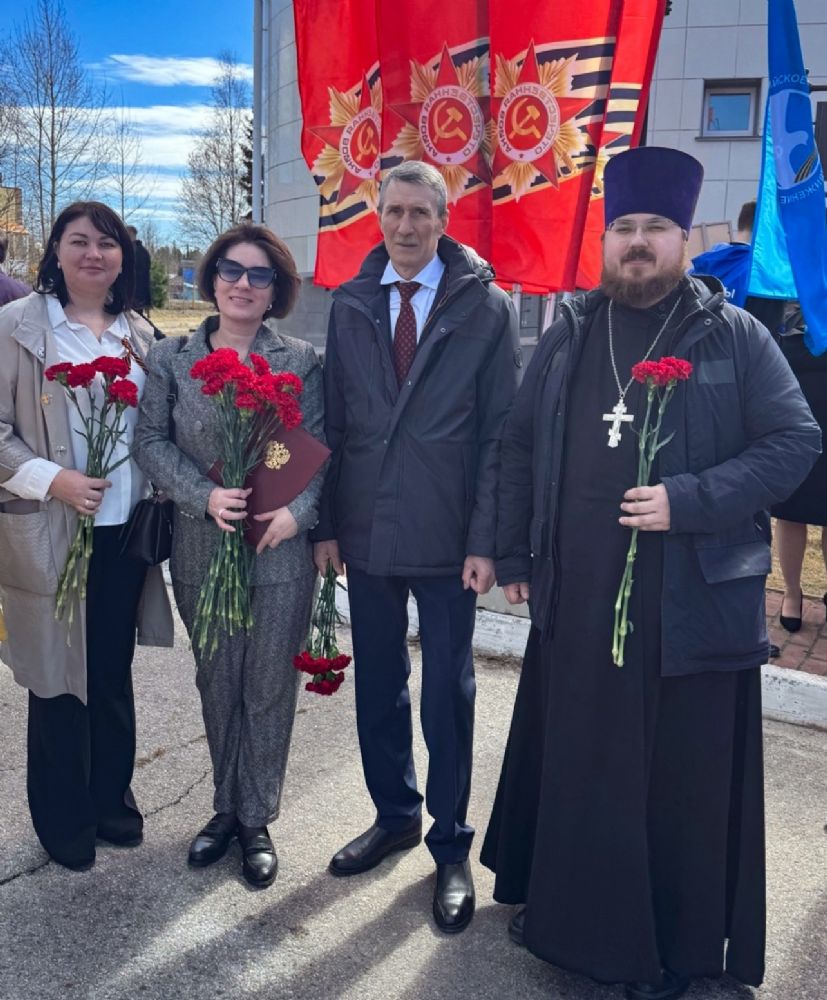 Днем настоятель храма вместе с управляющей делами администрации Нефтеюганского района Дорониной Натальей Михайловной, главой поселка Сентябрьский Андреем Владимировичем Светлаковым и жителями поселения принял участие в колонне "Бессмертный полк" с фотографиями солдат Великой Отечественной войны а затем у пмемориала "Никто не забыт, ничто не забыто" возложили цветы.