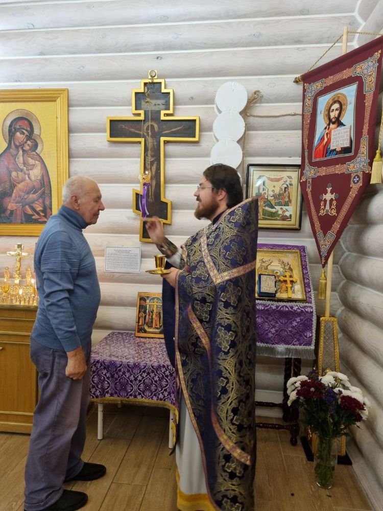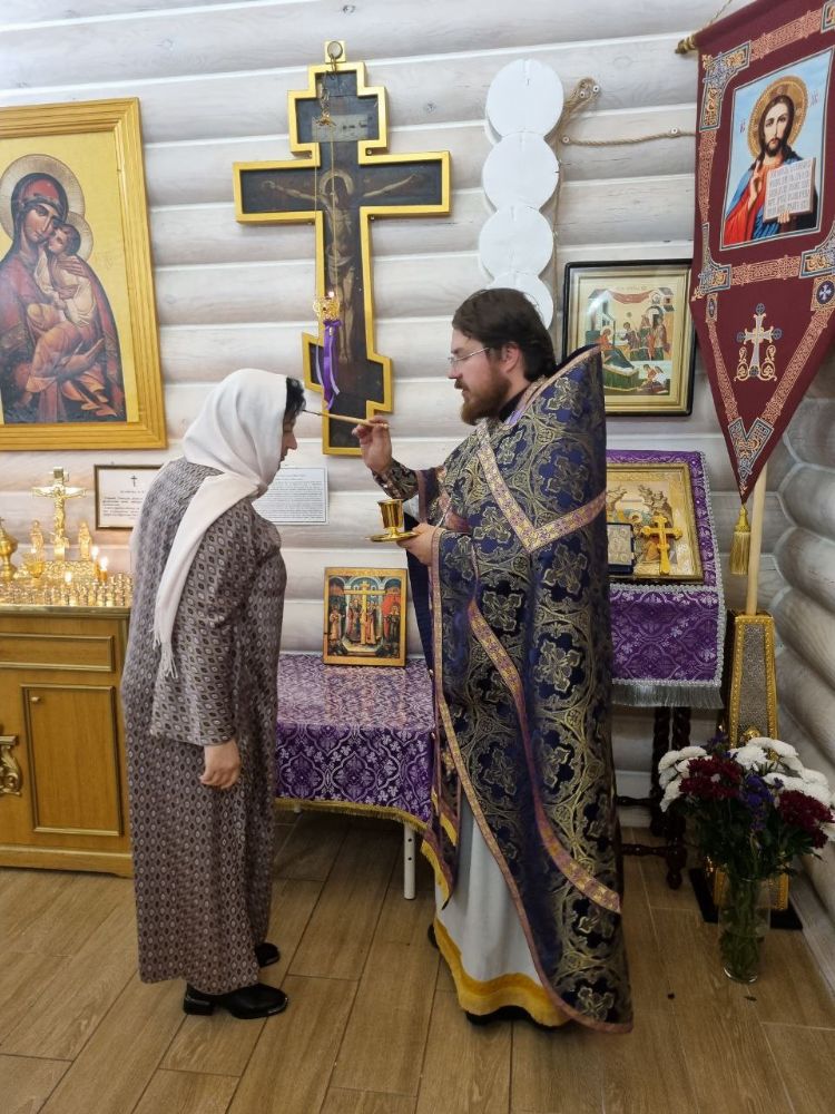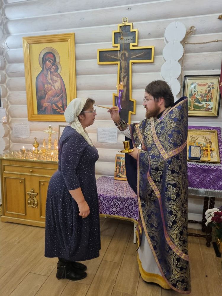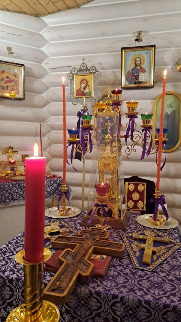 После великого славословия отец Иоанн вынес на центральный аналой Крест Господень. Затем был совершен особый Чин Воздвижения Креста, где на каждом особом прошении, Крест осенялся на все четыре стороны света. Помазывание освященным елеем было совершено у главной святыни нашего храма - древнего образа Креста Господня, которому примерно около 250 лет.