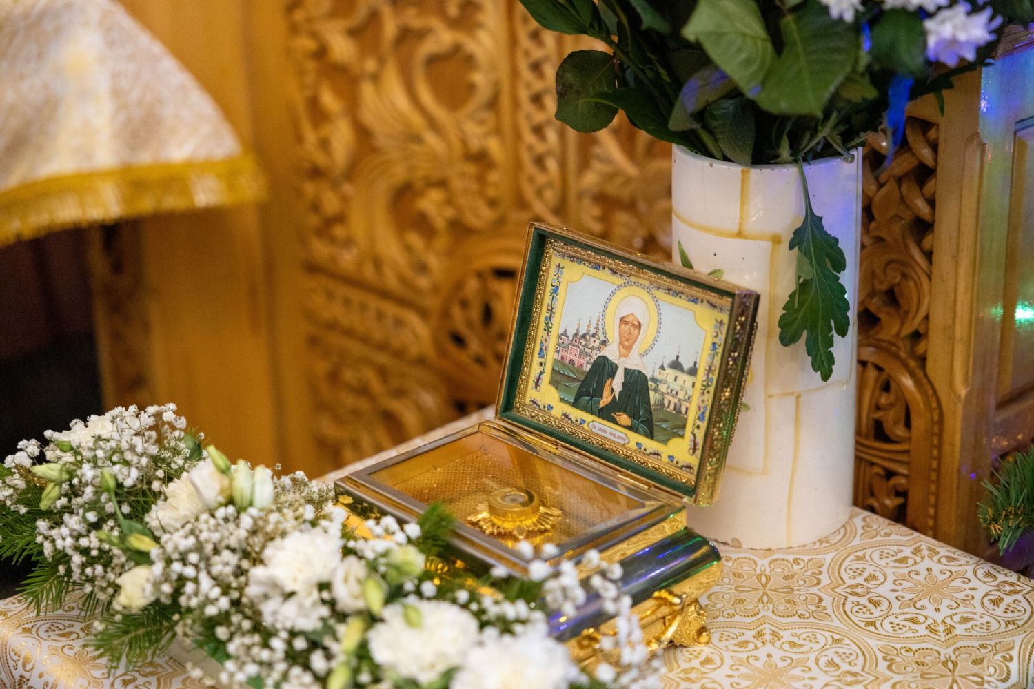 Перед началом Литургии, для поклонения верующим, в храм был принесен ковчег с частицей мощей святой блаженной Матроны Московской.