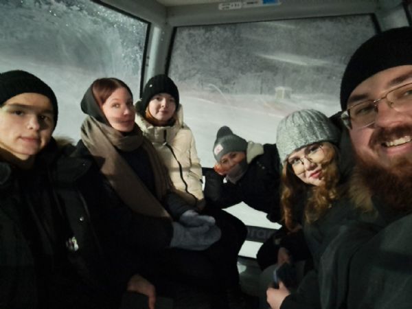 Вечером ждала насыщенная программа в горнолыжном комплексе "Хвойный Урман". Молодежь вместе с батюшкой катались на коньках, сноубордах, активно проводили время на свежем воздухе, а в завершении прокатились по канатной дороге и любовались городом.