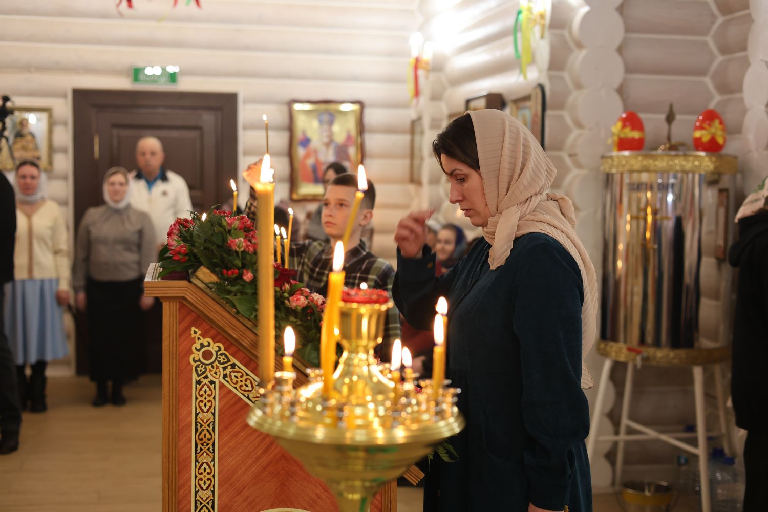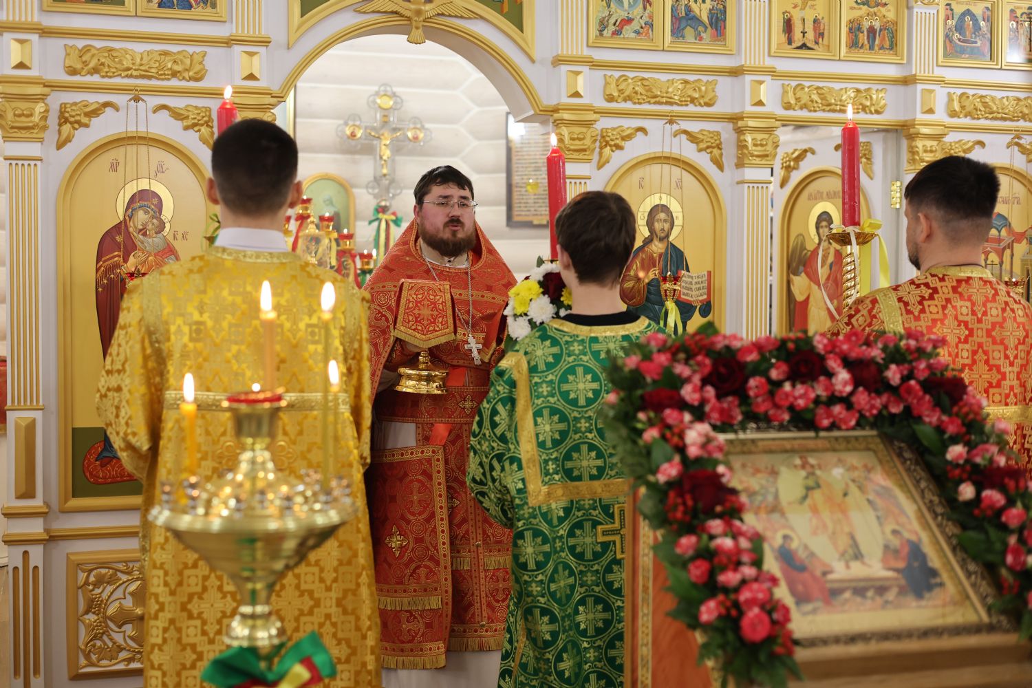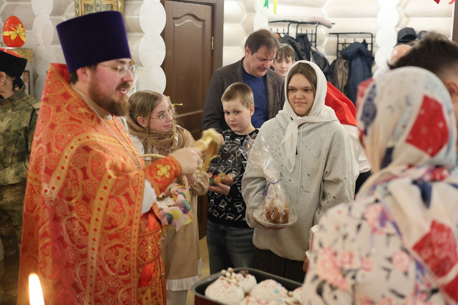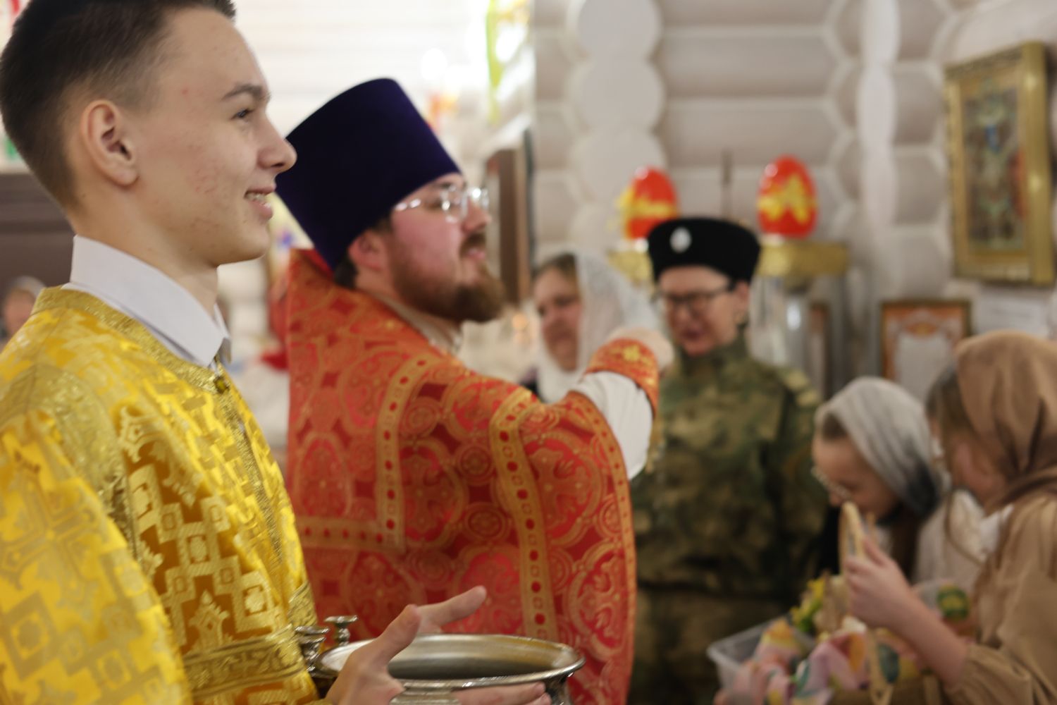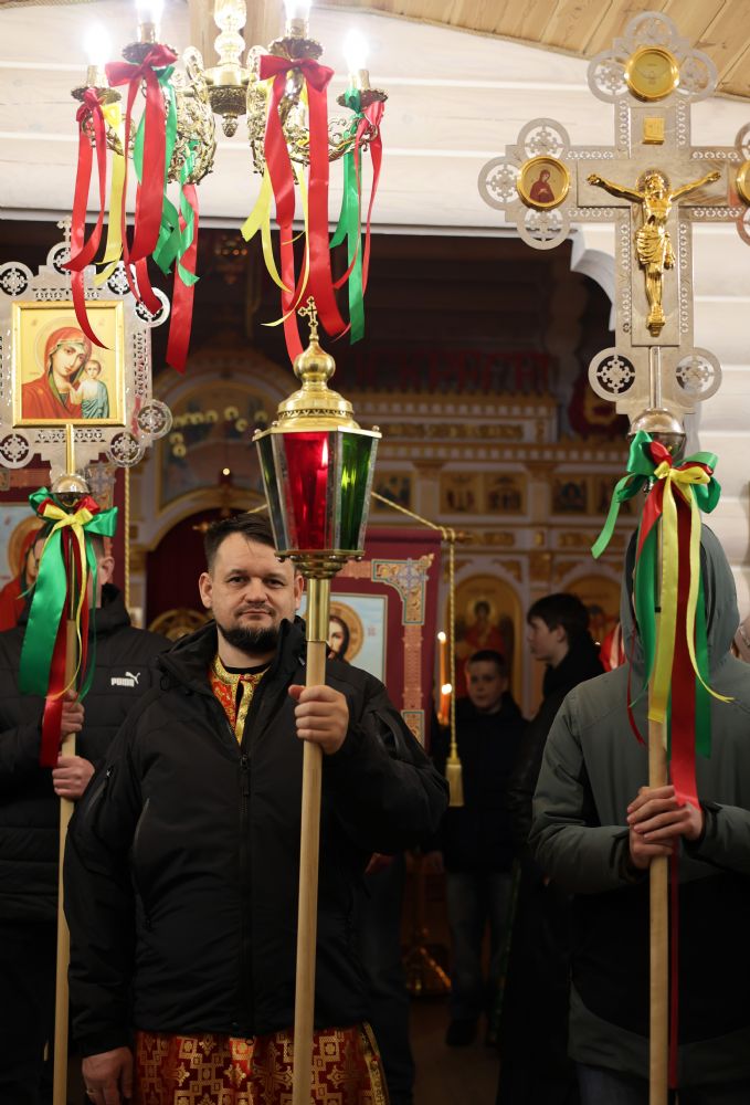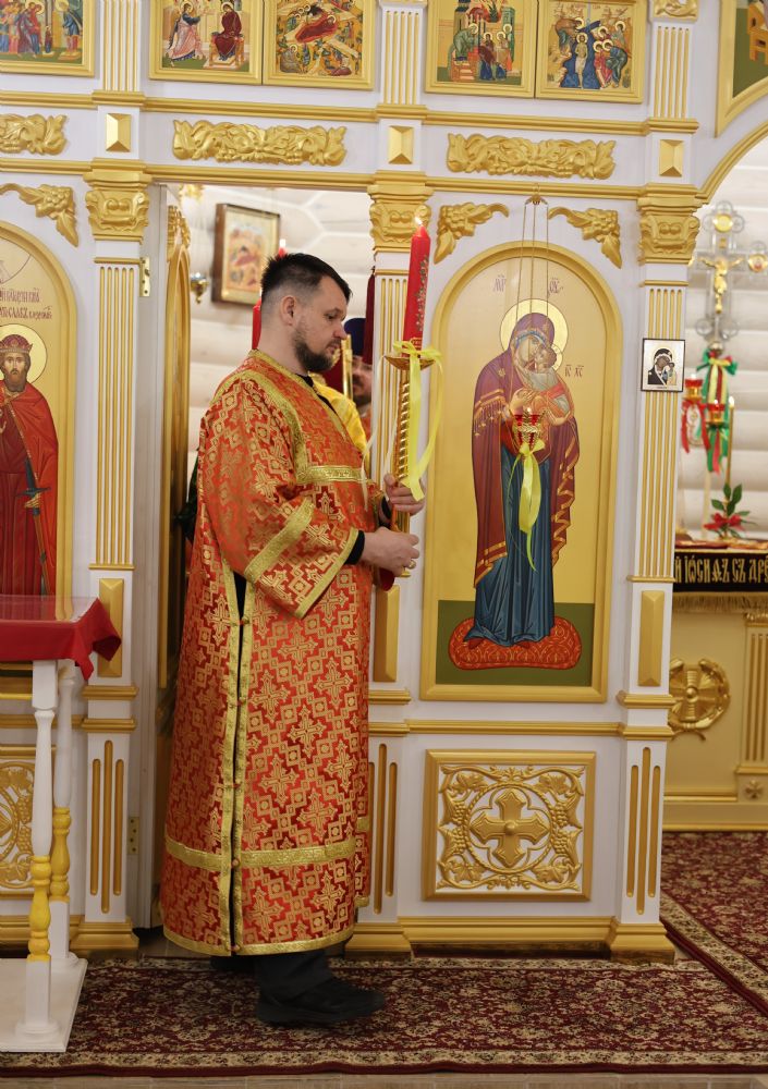 За Пасхальной Божественной литургией, отец Иоанн вознес молитву о Святой Руси, читаемую по благословению Патриарха Московского и всея Руси Кирилла. После заамвонной молитвы были освящены артос, принесенные верующими куличи, пасхи и яйца.